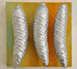 Ikonenhafte Inszenierung von gefundenen und abgegossenen Tannenzapfen (eigentlich Fichtenzapfen).